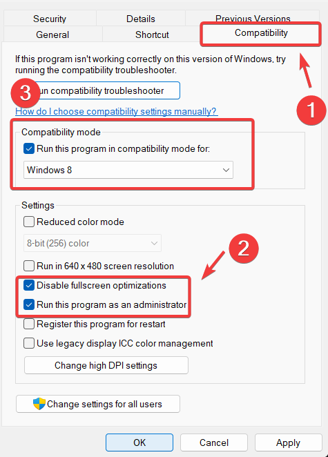 - Check Run this program as an administrator and Disable full-screen optimizations.