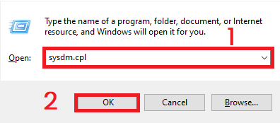 - Type “sysdm.cpl” and press Enter.