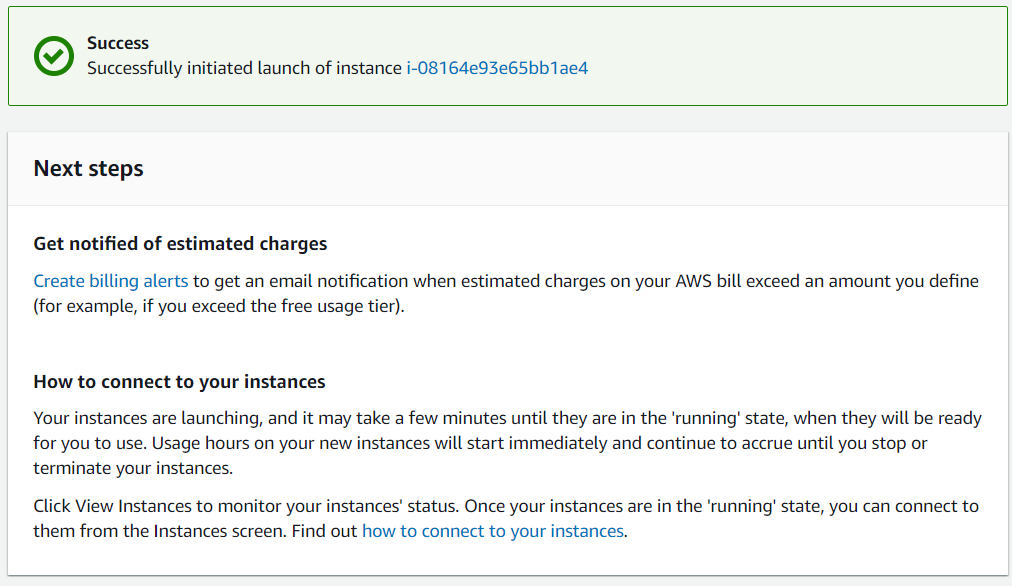 - You have successfully initiated the launch of instance “ID”. Please click on ID. In our case it is i-08164e93e65bb1ae4.