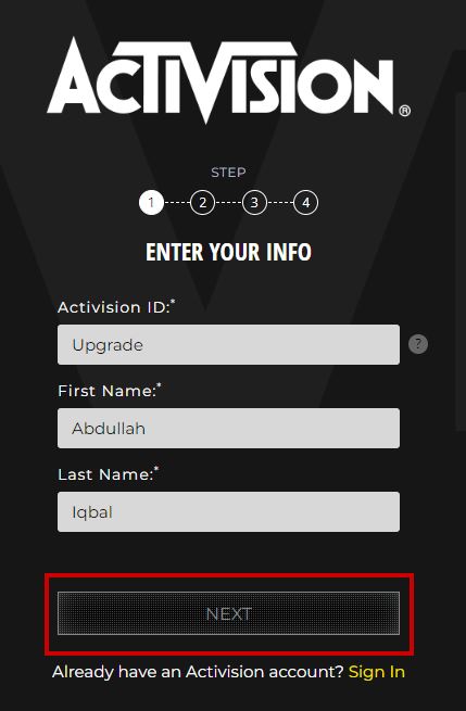 - Enter Activision ID (the nickname that will show in-game) and your first and last name.