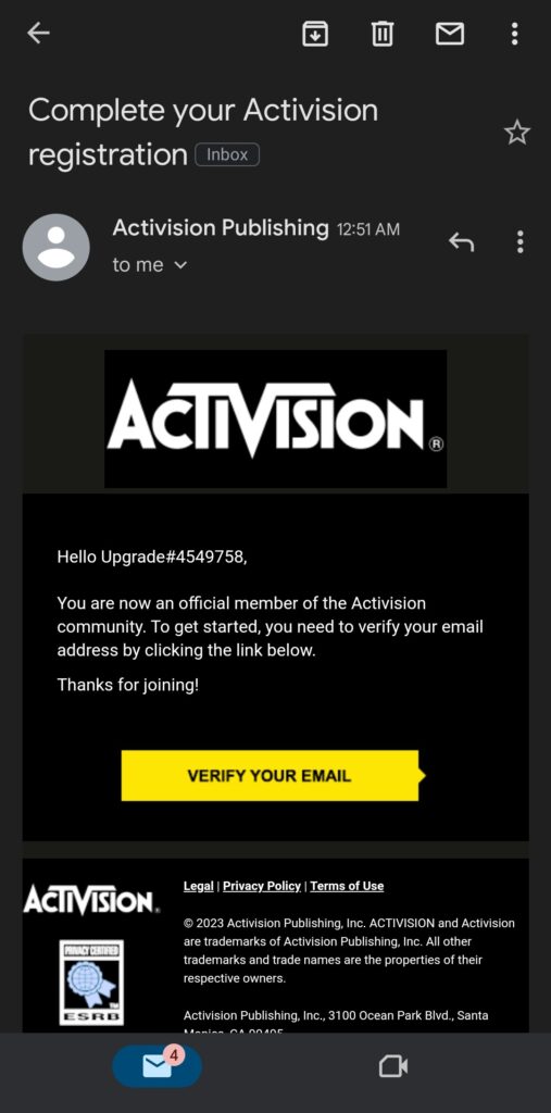 - Once done, you’ll receive an email from Activision Publishing to verify your account.