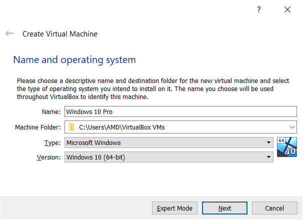 in order to create a new virtual machine - Under Name and operation system choose a descriptive name and destination folder for the new virtual machine and select the type of operating system you intend to install on it and then click Next. The name you choose will be used throughout VirtualBox to identify this machine. In our case the name of the virtual machine is Windows 10 Pro, we will keep the default location. The type and version of the operating system will automatically change based on your descriptive name. If it is not changed, please do it by yourself.