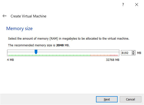 - Under Memory size select the amount of memory (RAM) that will be allocated to the virtual machine and then click Next. Please use the slider to configure RAM. In our case, we will assign 8 GB of RAM memory. In case you are not able to assign 8 GB due to your host´s resources, please assign the 4 GB.