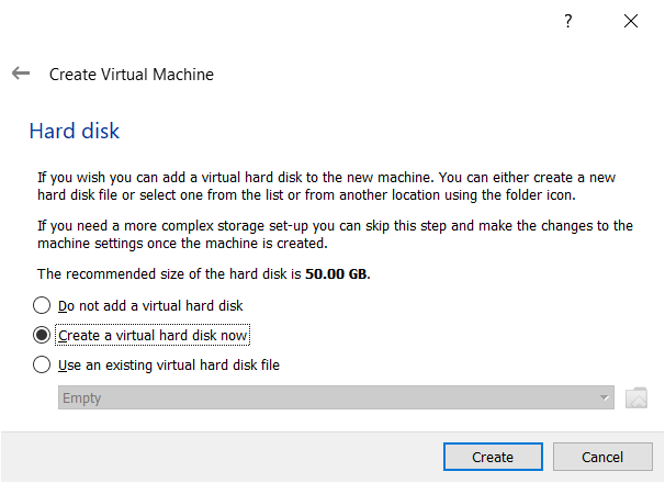 - Under Hard disk select Create a virtual hard disk now and then click Create. In this window, you will be also able to use an existing virtual hard disk or skip creating a new hard disk. As we do not have a virtual disk, we will create a new one.