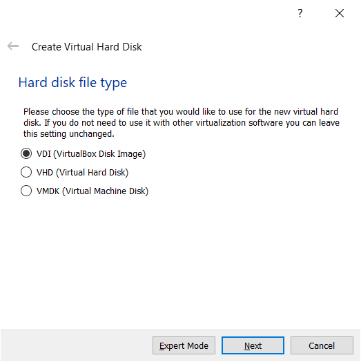 - Under Hard disk file type choose VDI (VirtualBox Disk Image) and then click Next. As you can see there are three different hard disk types including VDI, VHD, and VMDK. VDI is used by Oracle VirtualBox, VHD is used by Hyper-V and CMDK is used by VMware.