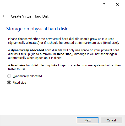 - Under Storage on physical hard disk select Fixed size and then click Next. As you can see there are two storage types including dynamically allocated and fixed size. A dynamically allocated hard disk file will only use space on your physical hard disk as it filly up (up to maximum fixed size), although it will not shrink again automatically when space on it is freed. A fixed-size hard disk file may take longer to create on some systems but is often faster to use.