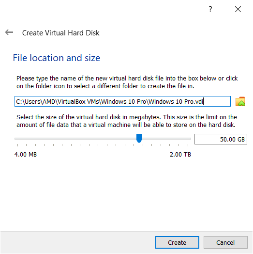 - Under File location and size choose the location where you would like to store your virtual hard disk and choose the file size. We will keep the default virtual disk size which is 50 GB and then click Create.
