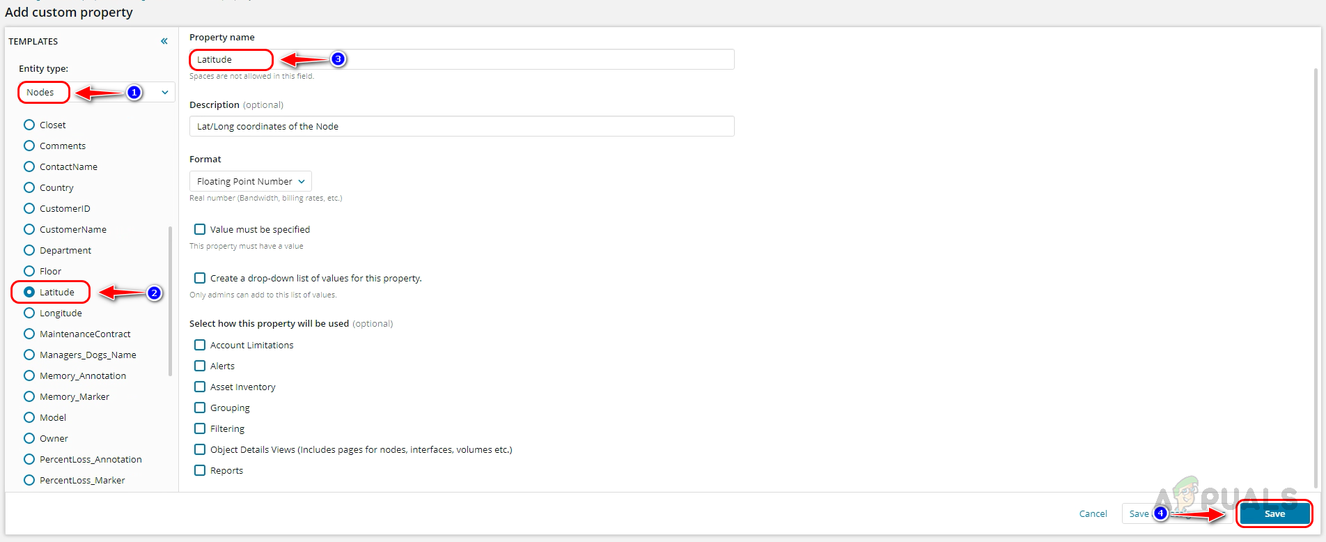 - Select Nodes in Entity Type. Latitude is one of the default properties available for nodes. You can choose it from the list. If unavailable, type Latitude on Property Name, choose Floating Point Number in Format and click on Save.