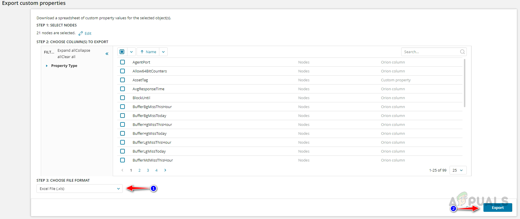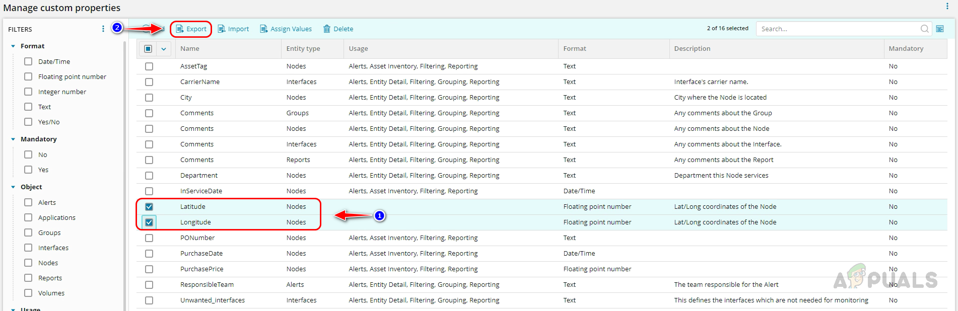 - Select Latitude and Longitude from the list on the Manage Custom Properties page and click on Export.