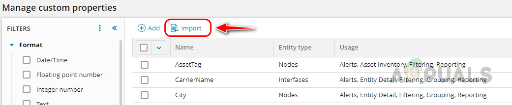 - On the Manage Custom Properties page, click on Import.