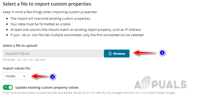 - Browse and select the updated sheet, ensure Nodes is selected in Import values for, and click on Next.