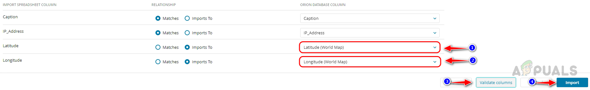 - Now, select Latitude(World Map) from the drop-down list of Latitude. Select Longitude(World Map) in Longitude. If this is not done, nodes will not be placed on the map. Click on Validate Columns. Once the success message is displayed, click on Import.
