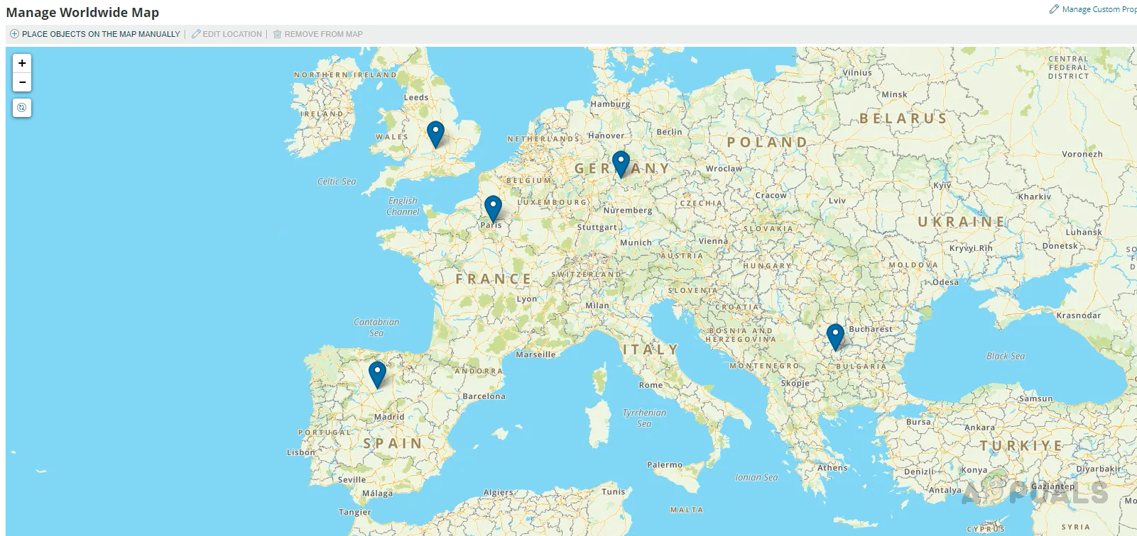 - After the custom properties are imported, go to the Manage World Map page, and we can see the nodes placed exactly on the provided latitude and longitude.