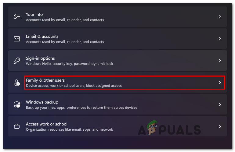 Accessing the Accounts menu - From the Accounts tab, move over to the right-hand side menu and click on Family & other users.