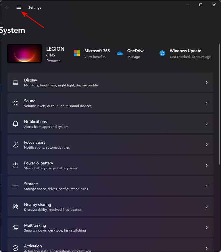 - Once you’re inside the Settings menu, access the side menu by clicking on the action button in the top-left corner of the screen.