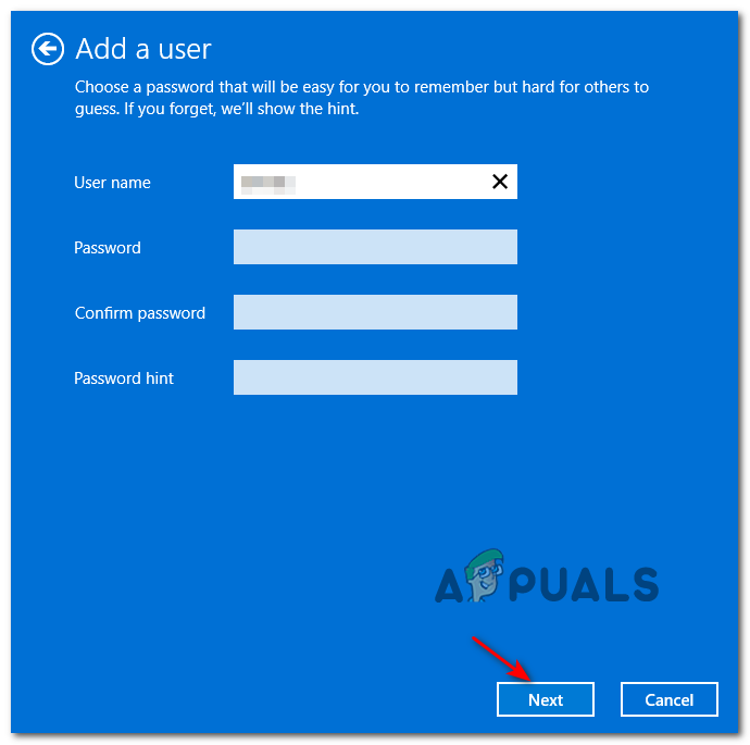- next, go ahead and insert the User Name, Password, and a password hint associated with the Local account that you wish to create. Once you are ready to go, click on Next to initiate the process.