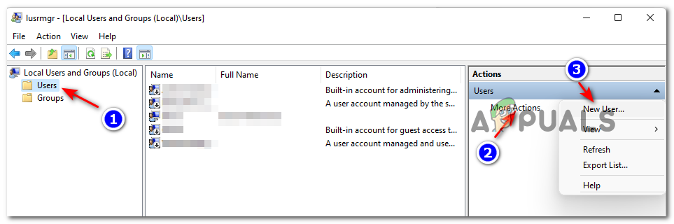 Creating a new Local account via the Local Users and Groups utility - After a couple of seconds, the account should be automatically created and added to the list of users inside the Local Users and Groups utility. At this point, you can safely close the utility and restart your PC to log into the newly created local account.