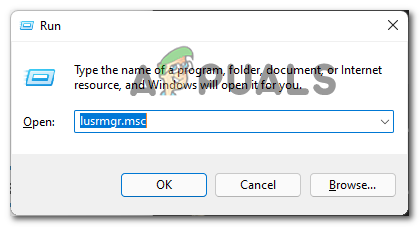 - Press Windows key + R to open up a Run dialog box. Once inside, type ‘lusrmgr.msc’ inside the text box and press Enter to open up the Local Users and Groups utility. When you are prompted by the User Account Control, click Yes to grant admin access.