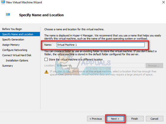 - Name your virtual machine by typing in the Name dialogue box. If you want to store your virtual machine to other location than the default one, check the box “Store the virtual machine in a different location” and then browse the directory. Click Next when you are done making changes.