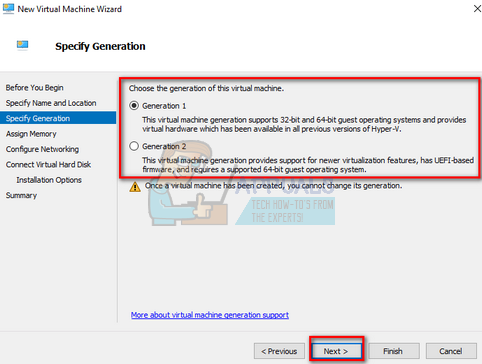 - Now will be required to choose the generation of your virtual machine. Generation 2 (UEFI/GPT) should be chosen for 64 bit Windows 8 or for later versions. For all other guest systems, you should select Generation 1 (BIOS/MBR).