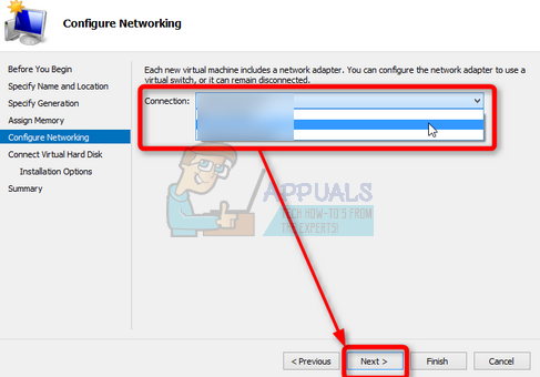 - Now select existing virtual switch (which we made in step 2) and click Next to proceed with the setup.
