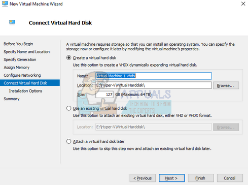 Note: By default, Hyper-V uses dynamically expanding VHD. If you create a VHD of 100 GB and only use 20 GB, Hyper-V will only use 20 GB. What size actually means is your virtual machine’s hard drive has the permission to expand up to 100 GB (which we allocated in this example). So the more applications you install or the more data you store, your VHD will increase in size proportionally.