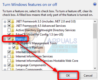 - Locate Hyper-V from the list of items. Check it and ensure that all subcategories are also checked by pressing the “+” icon beside Hyper-V.