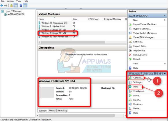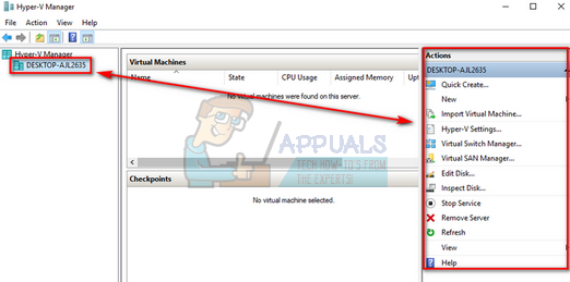 - Hyper-V will automatically connect to your host and show the menu on the right pane. Click the name of your computer at the left side of the pane.