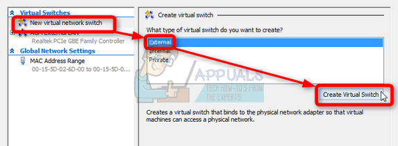 - When the manager pops up, select “New virtual network switch” from the left navigation pane, click “External” and then click the “Create Virtual Switch” as seen in the screenshot below.