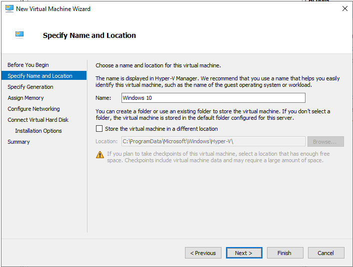 The procedure of creating virtual machines is the same as the procedure in other Hyper-V versions including Hyper-V 2012, Hyper-V 2016 and Hyper-V Client in Windows 8, Windows 8.1 and Windows 10. Our focus in this article is to create a virtual machine that will host Windows 10. We will not focus on the details, but only necessary steps to create the first virtual machine.
