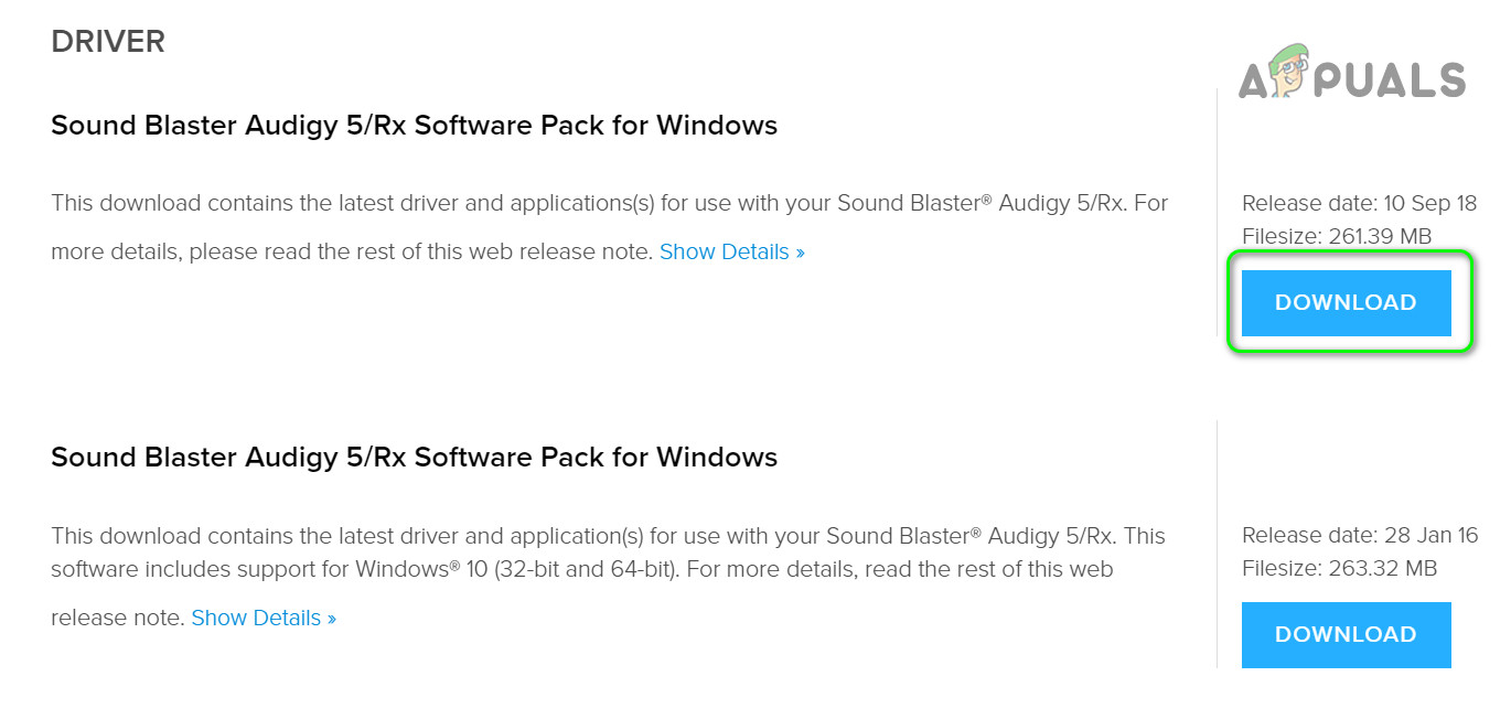 - Open a web browser and navigate to the Driver page of the Sound Blaster Audigy Rx (usually, SBA5_PCDRV_L11_3_01_0056B).