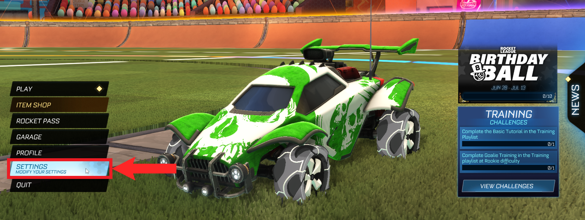 The Rocket League start screen - Now, on the main menu, select Settings.