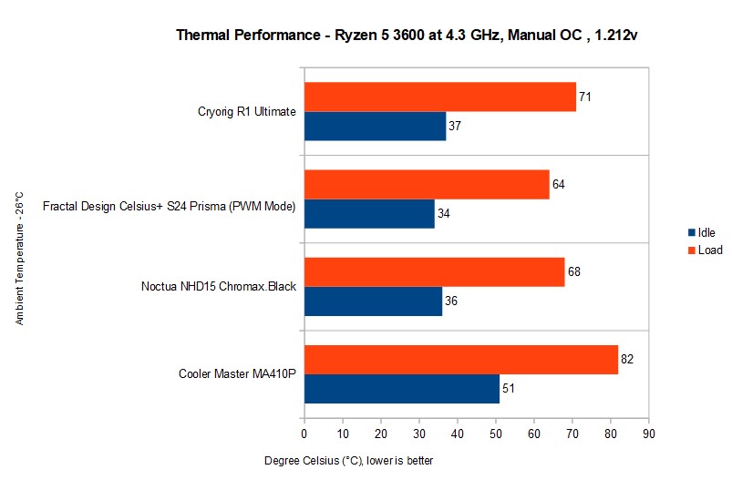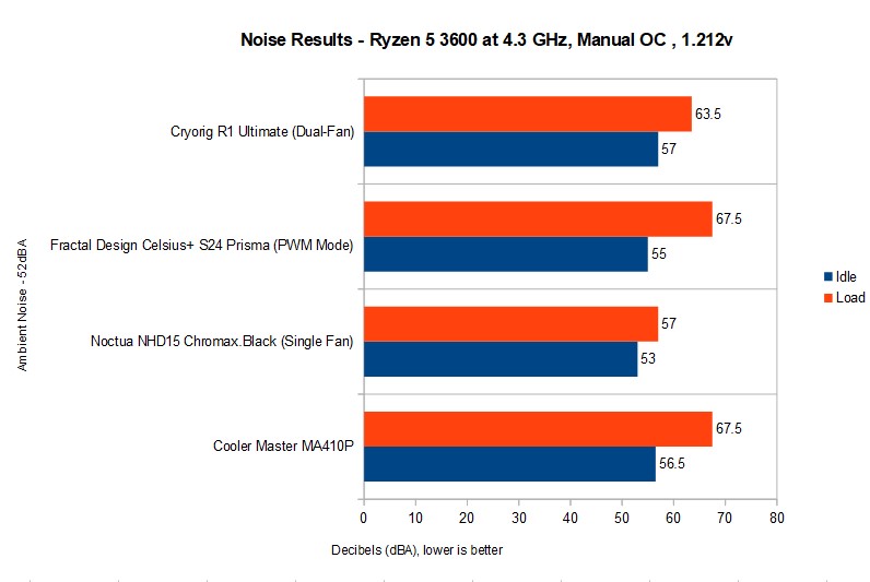 Ultimately, the R1 Ultimate was quieter than the Fractal Design S24+ Prisma liquid cooler, considering that the R1 Ultimate had 2x140mm Fans running in comparison with the Noctua NHD15 (Single Fan) results, the R1’s single fan operation would only increase 2-4C degrees while maintaining the acoustics almost the same as that of the NHD15. The Manual OC Noise results are very impressive. The results can be seen below.