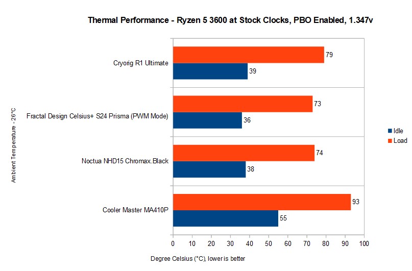 The stock thermal results of our CPU (Ryzen 3600) were a bit unorthodox right off the bat, with PBO enabled the CPU reached an average power consumption of 75-80W with around 1.347 core voltage. PBO did a fine job boosting the CPU clocks but the volt control was definitely not perfect which caused the Ryzen 3600 to draw more power than it is supposed to. Still, in this environment, the Cryorig R1 Ultimate did not fail to impress with its sheer power of seven heat pipes and kept the CPU in normal thermal states. As a reference we’ve added the results of Cooler Master’s MA410P as well, the 4 heat-pipe cooler failed to keep the Ryzen 3600 in its acceptable thermal ranges. All in all, the rest of the coolers results including the Cryorig R1 Ultimate show how well a bigger and beefier cooler can handle these modern power-hungry CPUs. The results can be seen below.