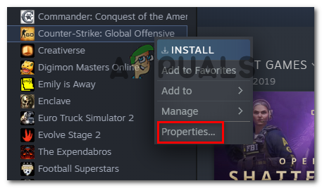 - Next, access your Library from the ribbon menu at the top, then right-click on Counter-Strike: Global Offensive and click on Properties from the newly appeared context menu.