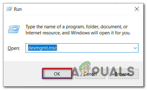- Press Windows key + R to open a Run dialog box. Type ‘devmgmt.msc’ and press OK to open the Device Manager.