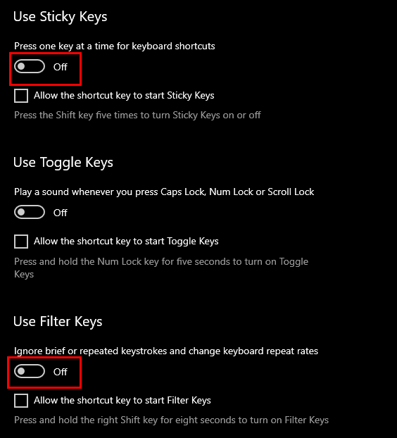 - Make sure both Sticky Keys and Filter Keys are toggled off.