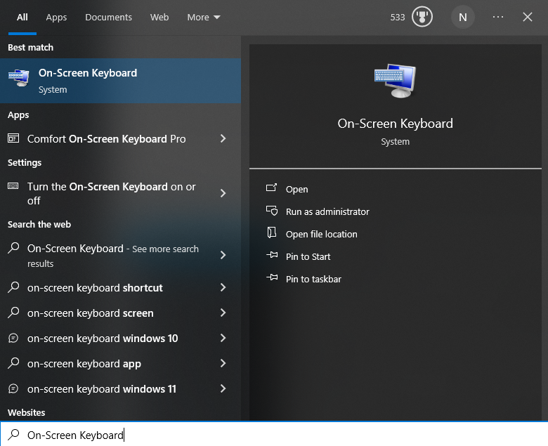 - Press the Windows key and type “On-Screen Keyboard”, then select to open it.