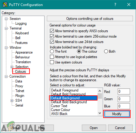 Opening PuTTy through Windows search feature - Click on the Colors option under the Window section. Now select the Default Background in the list-menu and click the Modify button.