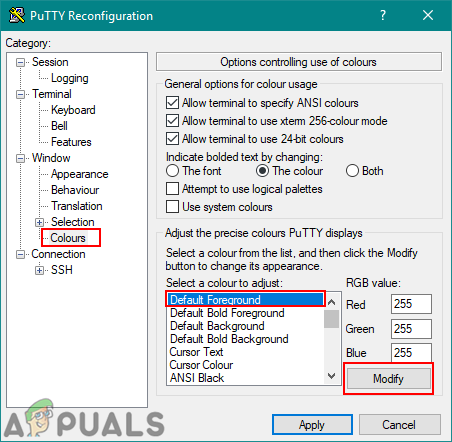 Opening Configuration settings for the running session - Go to the Colors settings under the Window list on the left side. Click on the Default Foreground option in the list-menu and press the Modify button.
