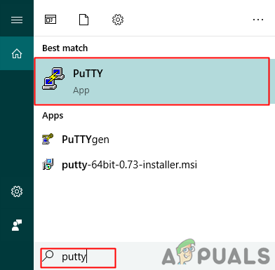 - Hold the Windows key and press S to open the search function. Search for Putty and press Enter to open it.
