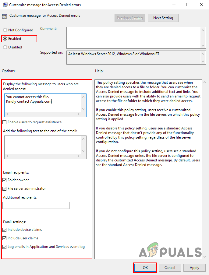 Opening the path - After that, double-click on the “Customize message for Access Denied errors” setting. A new window will open up, modify the toggle from Not Configured to Enabled. Then set the custom message for the users who will get access denied.