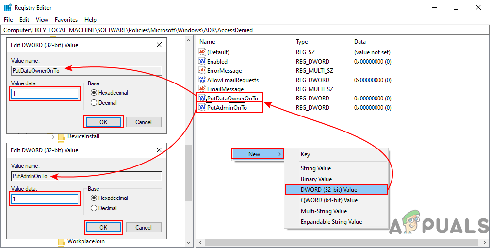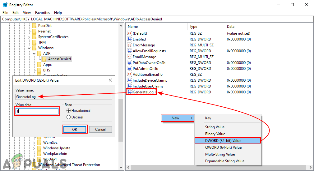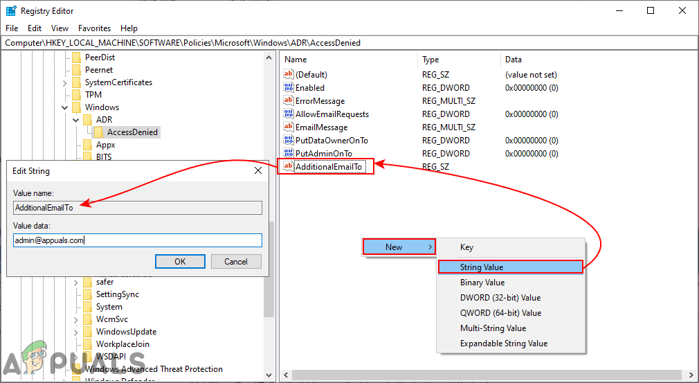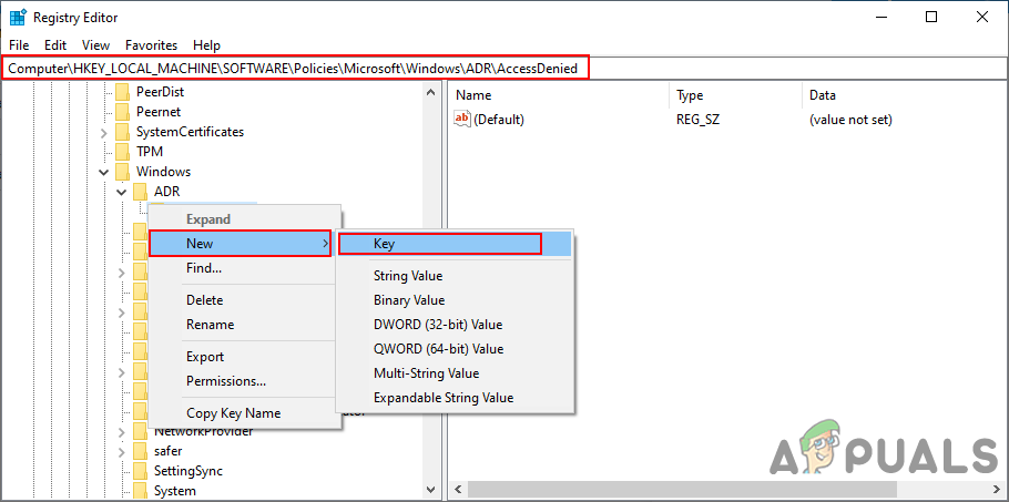 - Some of the keys may be missing, so just create it by right-clicking on the key that is available and choosing New > Key option. In our case, “ADR” and then “AccessDenied” were the two keys missing.