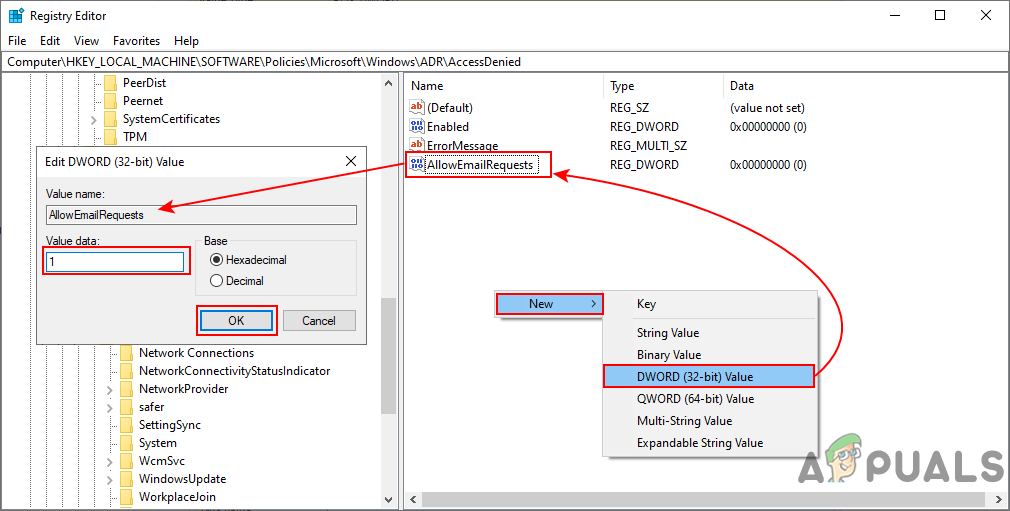 Writing a customized message - To enable request assistance, you can create value by right-clicking on the right pane and choosing New > DWORD (32-bit Value). Name it as “AllowEmailRequests” and change the value data to 1.