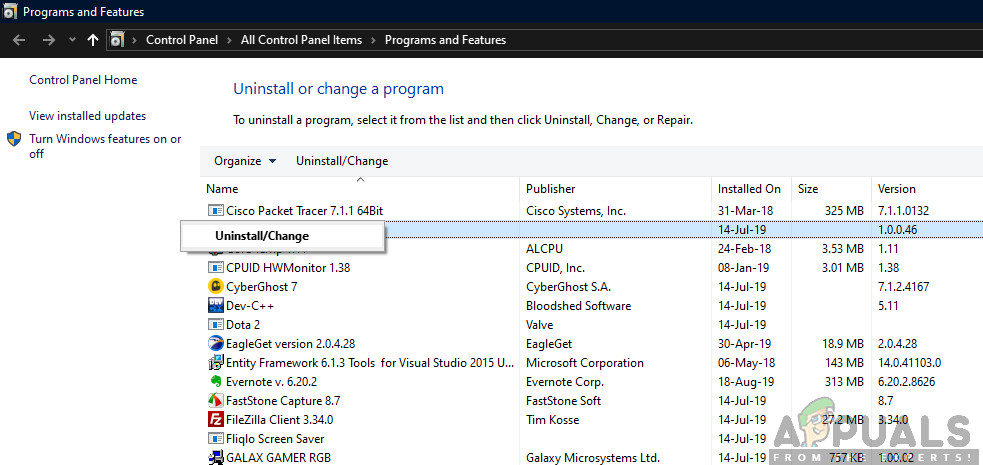 Type appwiz.cpl and Press Enter to Open Installed Programs List - Once you’re inside the Programs & features menu, scroll down through the list of installed applications and locate PlayTV, Raptr or whatever program you suspect might be triggering the ‘CX_Freeze Python Error in Main Script’ startup error.