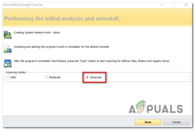 - At the next window, wait until the restore point is created, then click on Advanced from Scanning modes and click on Scan to remove any leftover files.