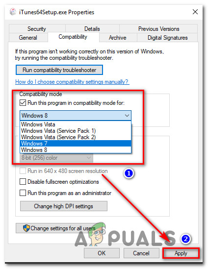 - Finally, select an older Windows version from the drop-down menu that just appeared and click Apply. If you’re experiencing this issue with a legacy game, select the oldest Windows version from the list.