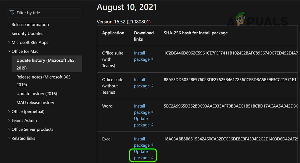 - Now, under the most recent version of Office, click on Update Package (in front of Excel) and let the package download.