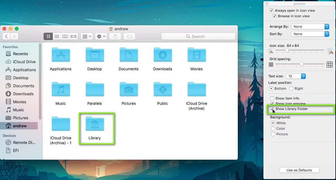 - Open the Mac’s Finder and head to the Library folder. If the Library Folder is not shown, right-click on the empty area, select Show View Options and check Show Library Folder. You can also open the Library folder by pressing Command +Shift + G and entering ~/Library.