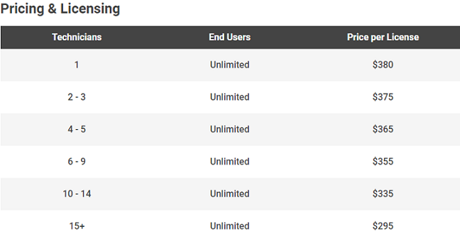 I think the Dameware Remote Support pricing plan is quite clever and convenient. SolarWinds charge you based on the number of Technicians using the software but does not impose a limit to the number of remote computers the technician can connect to. This, therefore, allows you to use fewer administrators to support several end-users and consequently save on administration costs.